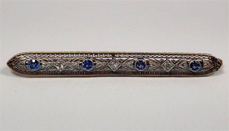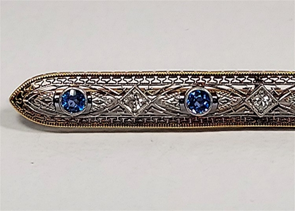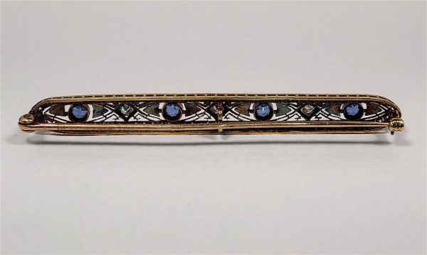 Antique Yogo Sapphire & Diamond Bar Pin, with G.I.A. Report 14k Y.G., 6.8 cm / 2.75 inches