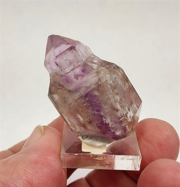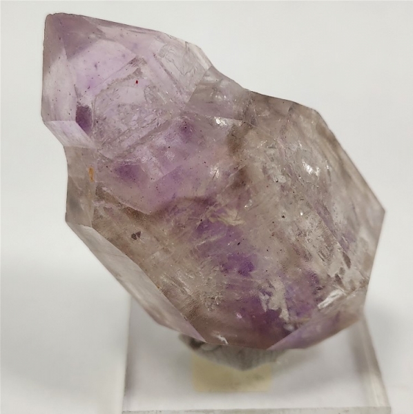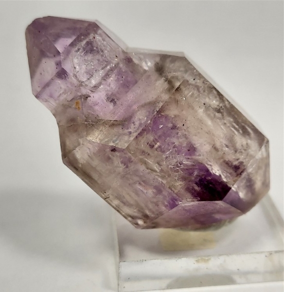 This DT reverse scepter has a light colored amethyst core surrounded by clear and slightly smoky edge terminations.