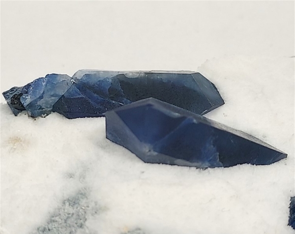 The sharply terminated benitoite crystals, have that beautiful blue coloring,