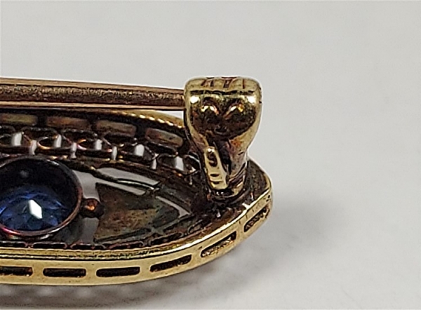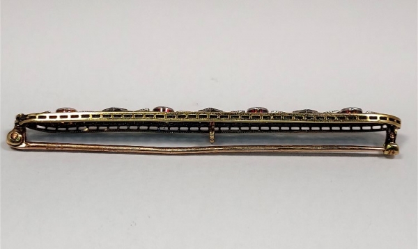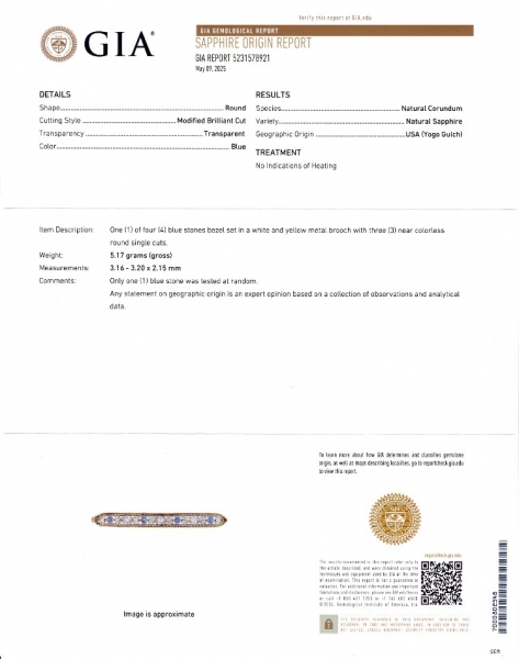 Antique Yogo Sapphire & Diamond Bar Pin, with G.I.A. Report 14k Y.G., 6.8 cm / 2.75 inches