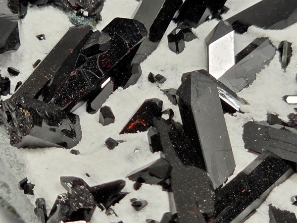 The deep black crystals really stand out against a blanket of snowy white Natrolite atop of a greenish blue schist.