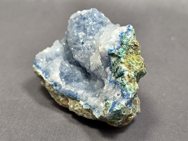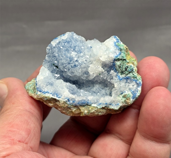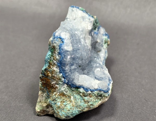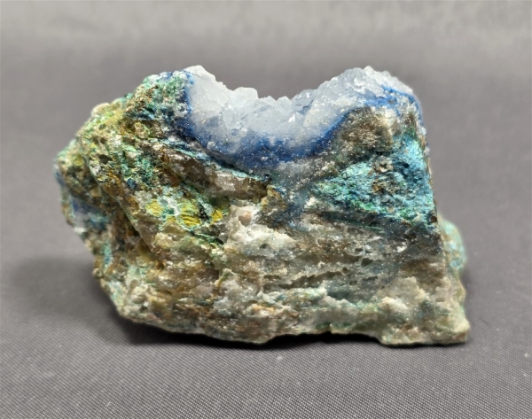 It has a coating of druzy quartz crystals giving the specimen a mirrorball look in the light.